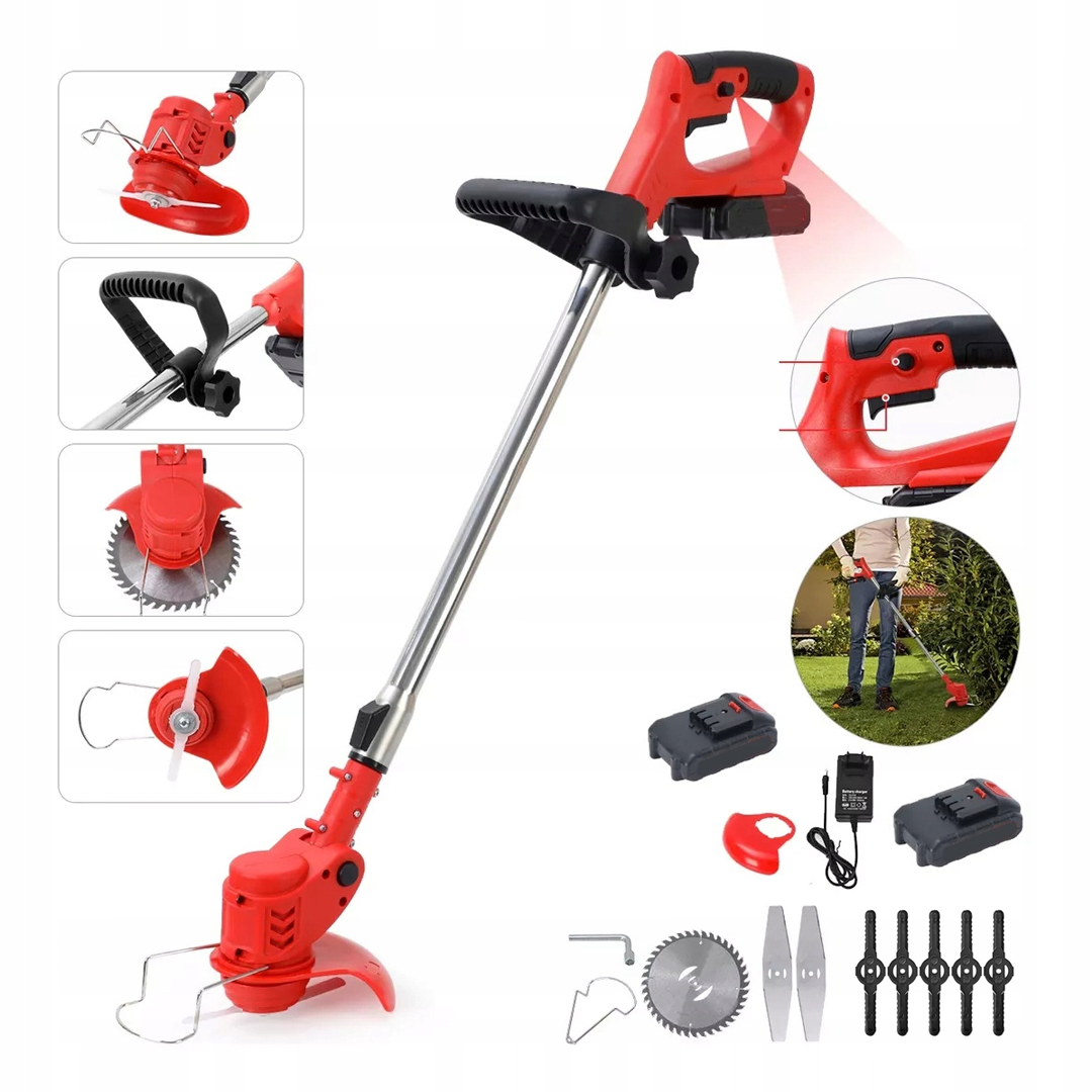 🌿 Dugotrajan i izdržljiv aku trimer sa dvije baterije, punjačem i ostalim priborom sa slike